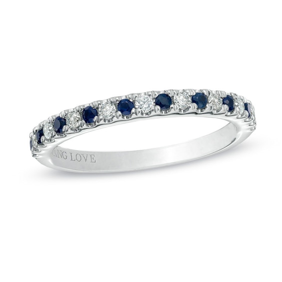 Vera Wang Wedding Rings. Diamond and blue sapphire wedding band in 14k white gold. Each timeless piece features a signature sapphire, the gemstone that represents everlasting love.